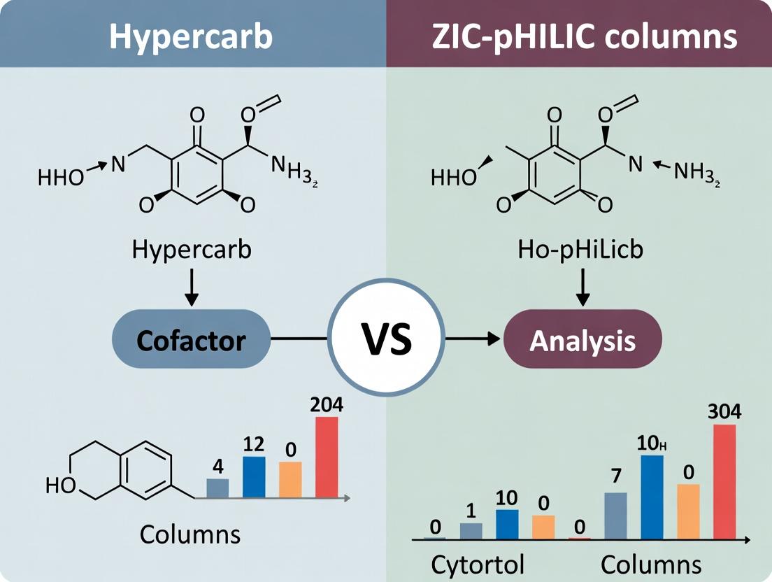 This article provides a detailed comparison of porous graphitic carbon (Hypercarb) and zwitterionic hydrophilic interaction liquid chromatography (ZIC-pHILIC) columns for the analysis of essential cofactors (e.g., NAD(P)(H), ATP, CoA, vitamins).