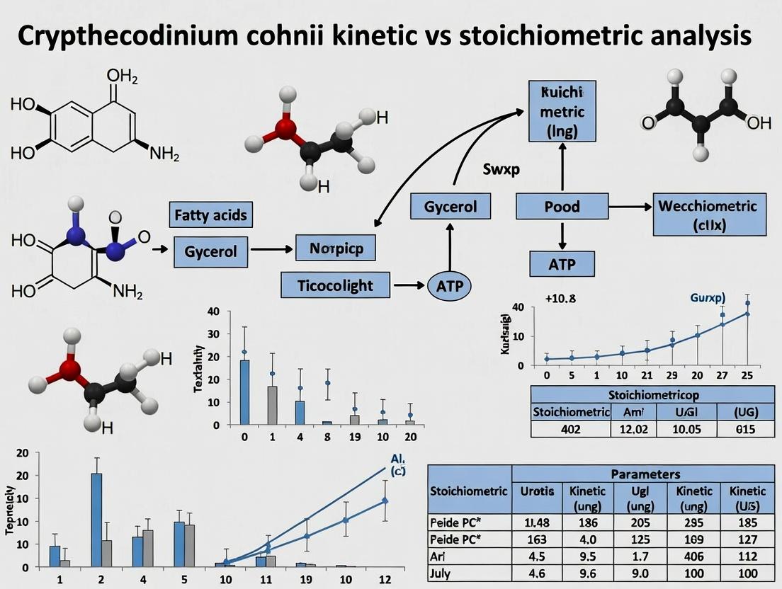 Kinetic and stoichiometric analyses provide powerful, complementary lenses for understanding and optimizing Crypthecodinium cohnii metabolism for high-value DHA production. While stoichiometric models like FBA offer a robust, system-wide view ideal for exploring metabolic capabilities and flux distributions under steady-state conditions, kinetic models deliver dynamic, mechanistic insights into transient states and regulatory controls. Successful application requires careful model construction, iterative validation with experimental data, and awareness of each method's limitations. The future lies in hybrid models and integration with multi-omics data, promising more predictive tools for strain engineering and bioprocess intensification. For biomedical and clinical research, advancing these models is crucial for reliably scaling DHA production, a molecule with proven significance in neurology, cardiology, and infant nutrition, and as a potential carrier for lipid-based drug delivery systems.