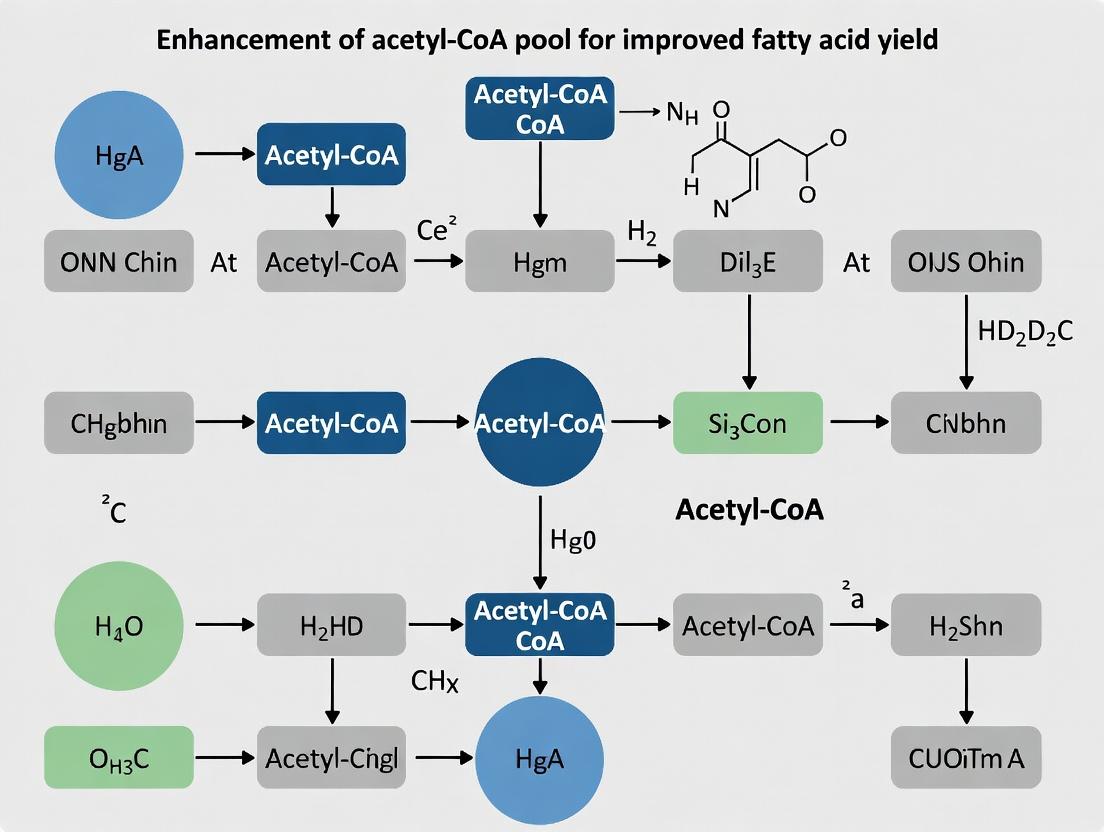 Enhancing the acetyl-CoA pool is a pivotal but complex strategy for improving fatty acid yield, requiring a systems-level approach that integrates foundational biochemistry, precise metabolic engineering, and robust validation. Success hinges on not only amplifying precursor supply but also synchronizing it with downstream pathway capacity and cofactor regeneration. Future directions point towards more sophisticated dynamic control systems, the application of machine learning for pathway design, and the translation of these strategies into clinical contexts, such as modulating lipid metabolism in cancer or metabolic disorders. For biomedical research, these approaches offer powerful tools to dissect disease mechanisms and identify novel therapeutic targets centered on metabolic reprogramming.
